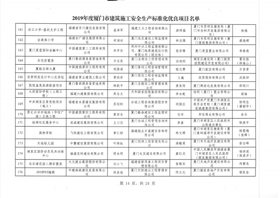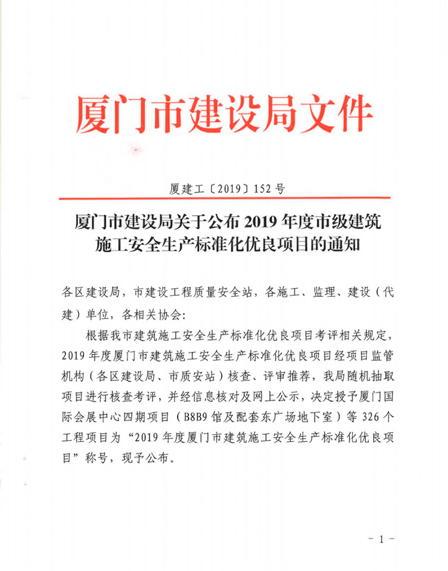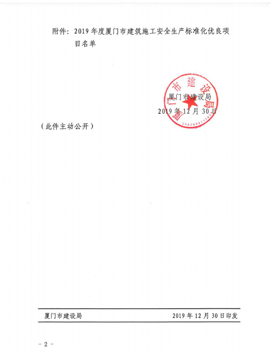 廈門市建設(shè)局關(guān)于公布2019年度市級建筑施工安全生產(chǎn)標準化優(yōu)良項目的通知